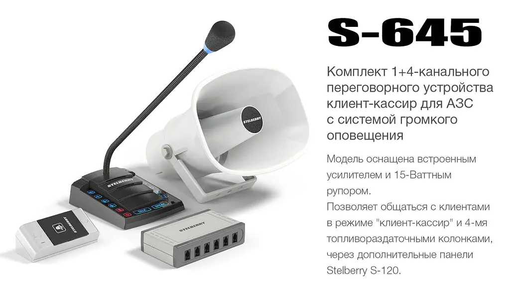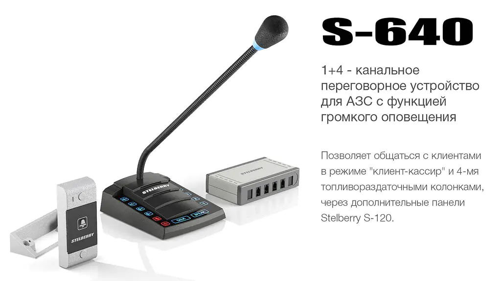 STELBERRY S-640. Это очень полезное и эффективное многоканальное переговорное устройство для АЗС, которое позволяет общаться не только кассиру с клиентом, как в одноканальных системах клиент-кассир, но и кассиру с заправщиками или водителями через дополнительные панели (до четырёх панелей в модели S-640), установленные на колонках.